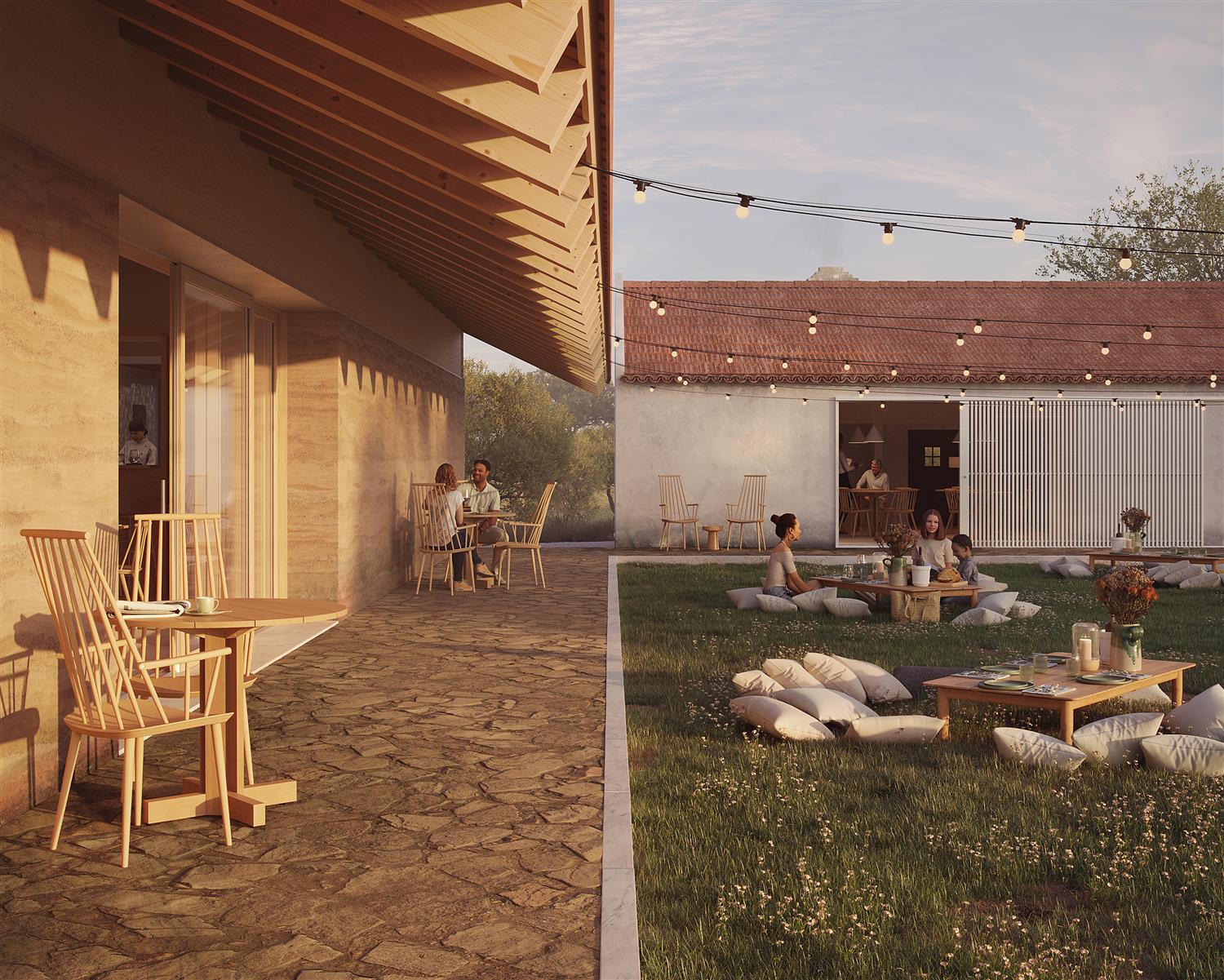 A central patio defines a new enclosed space that connects the two buildings and extends naturally into the surrounding landscape and the accommodation units. This intimate outdoor area becomes a flexible space for social gatherings, events, and moments of rest, fostering a strong relationship between architecture, nature, and community.