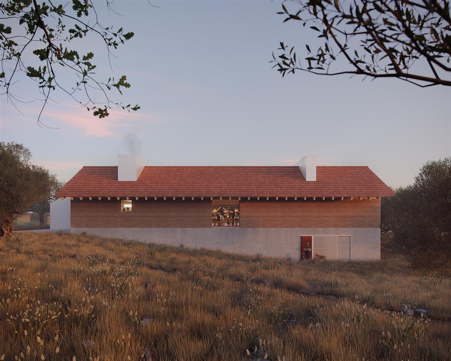 The foundation lies in a typological and material reading of the region, studied in the Inquérito à Arquitectura Popular Portuguesa. The traditional houses of the Grândola and Cercal slopes, compact, elongated, low, with gabled roofs and thick walls, serve as reference. Rather than replicating them, the design reinterprets their spatial intelligence and climatic resilience in a contemporary way.