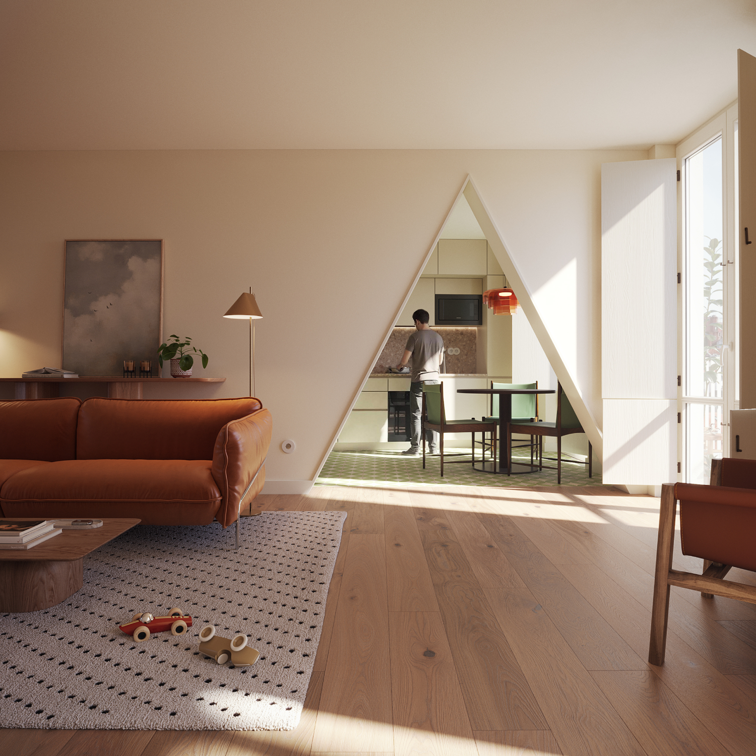 The plan includes the reorganization of the second floor and a new third floor, beneath a new shed roof. The new level will be enhanced by a series of dormer windows, aligned with the existing ones which will create small terraces. Each floor will accommodate one apartment, accessible via a staircase separate from the commercial space on the ground floor.