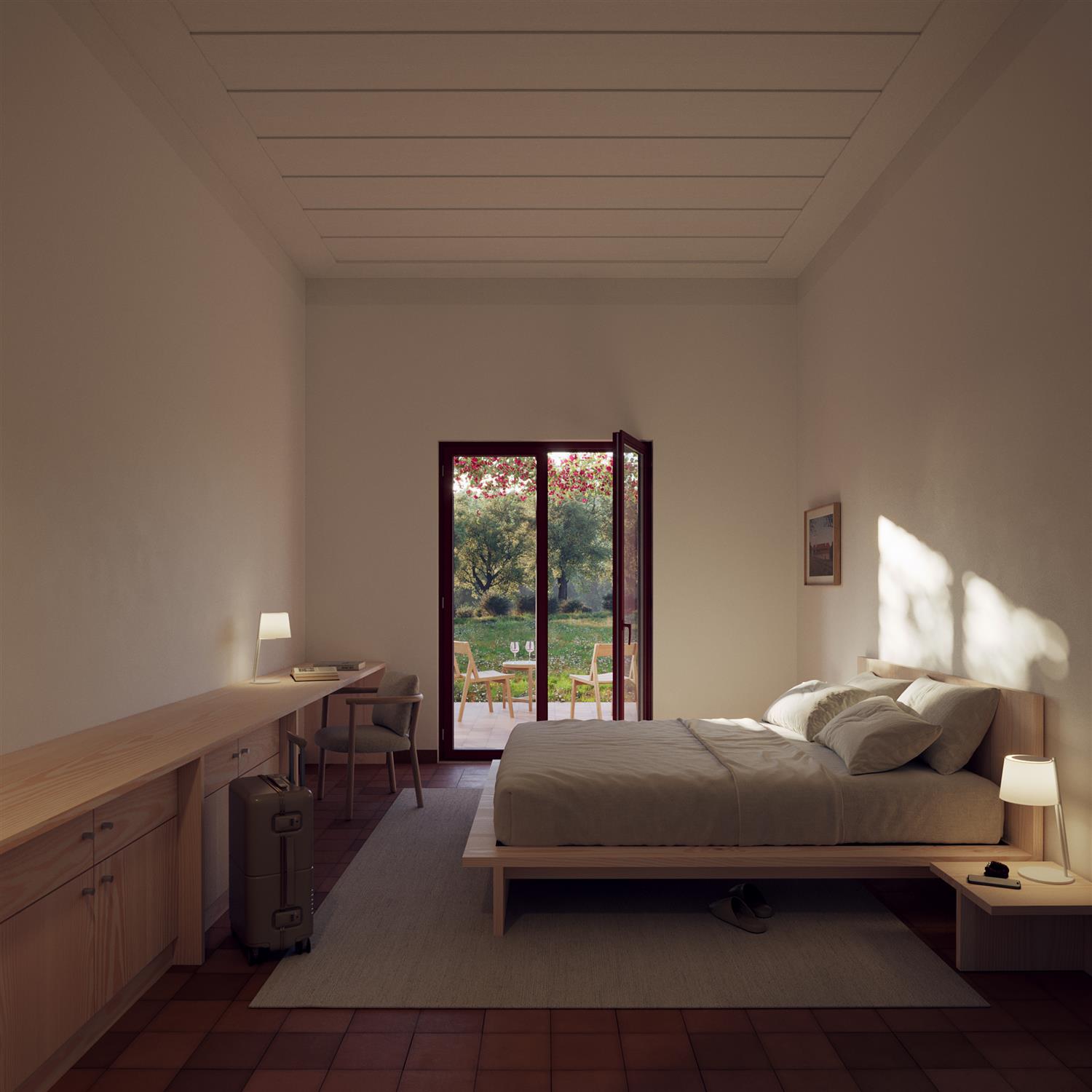 The proposal for converting the agricultural warehouse into the Rural Hotel is centered around preserving the original structure. The plan involves creating a series of double bedrooms, each with its own private entrance and an outdoor space. Additionally, is envisioned a new building at the end of the main patio, serving as a transition between the privacy of the hotel and the open agricultural land that will house the main restaurant.