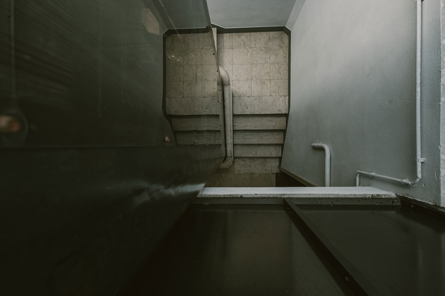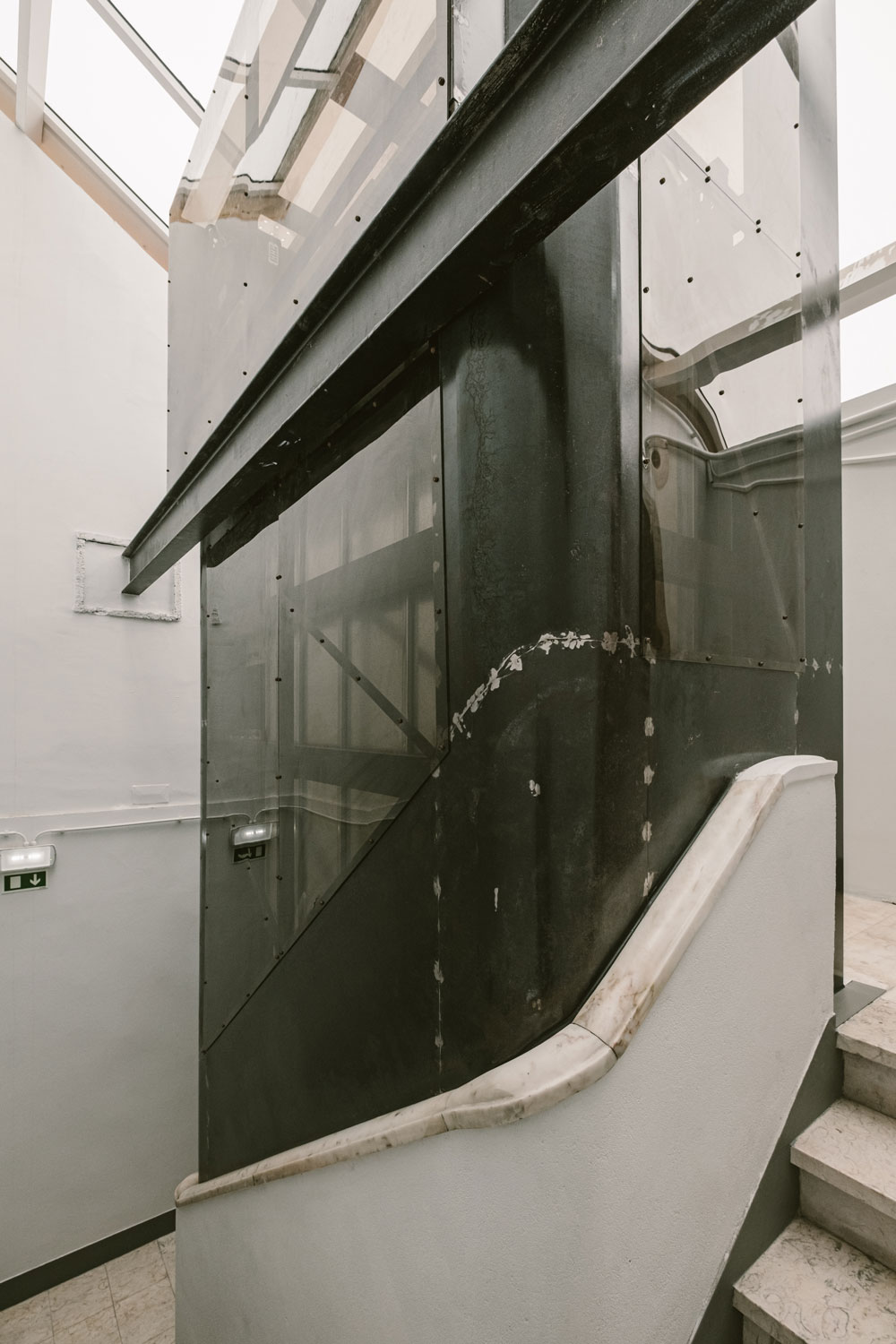 Using the elevator’s structural logic, while preserving the original guardrails and handrails, a new skin was introduced: 1.5mm thick treated iron panels combined with 5mm polycarbonate sheets. A continuous strip of translucent polycarbonate now lines all the stair flights, creating cross-visibility between levels and allowing daylight to diffuse throughout the building.